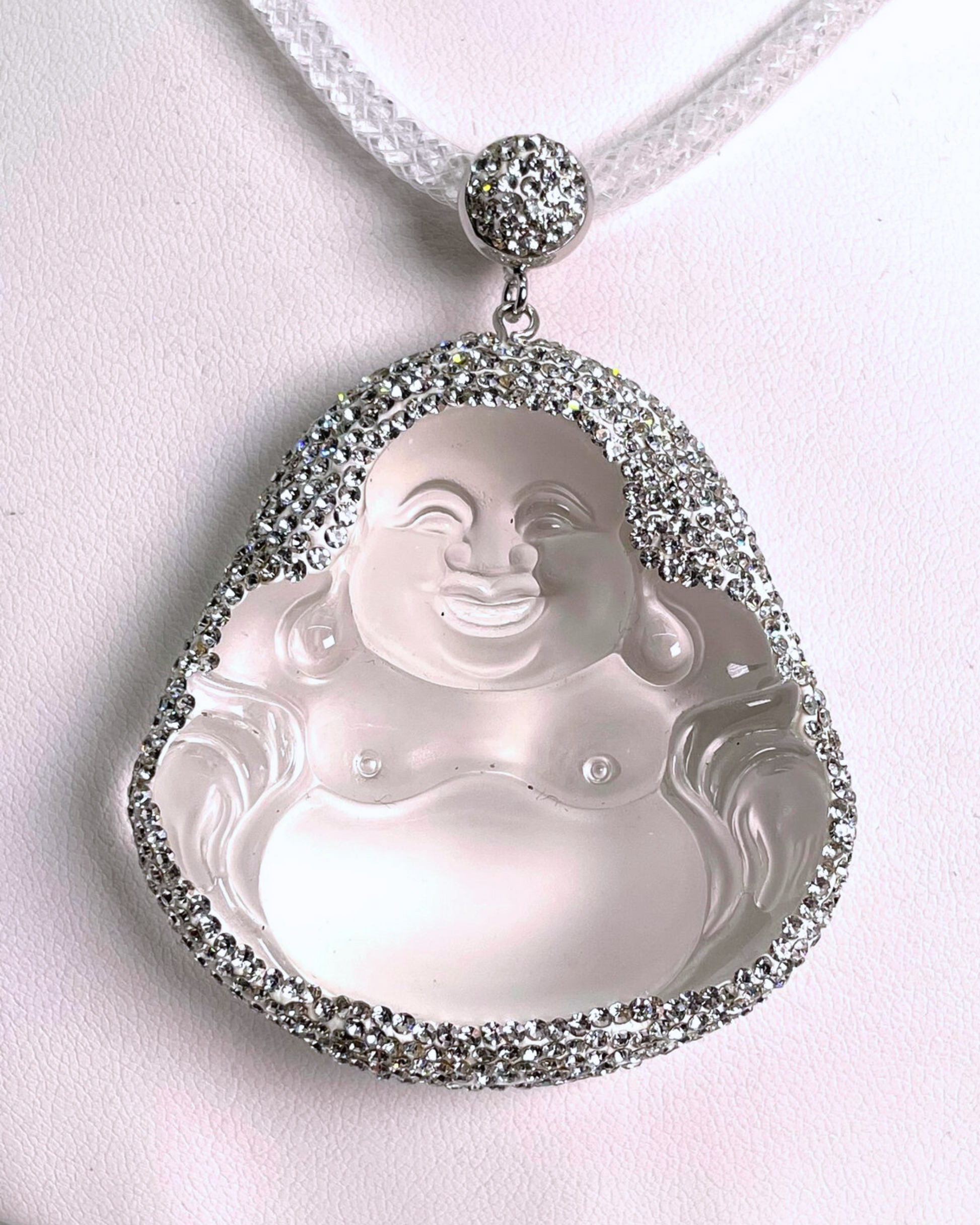 Clear "water" fat belly Buddha pendant with clear crystals and crystal bail, on crystal mesh cording. Only one available mark down from $125