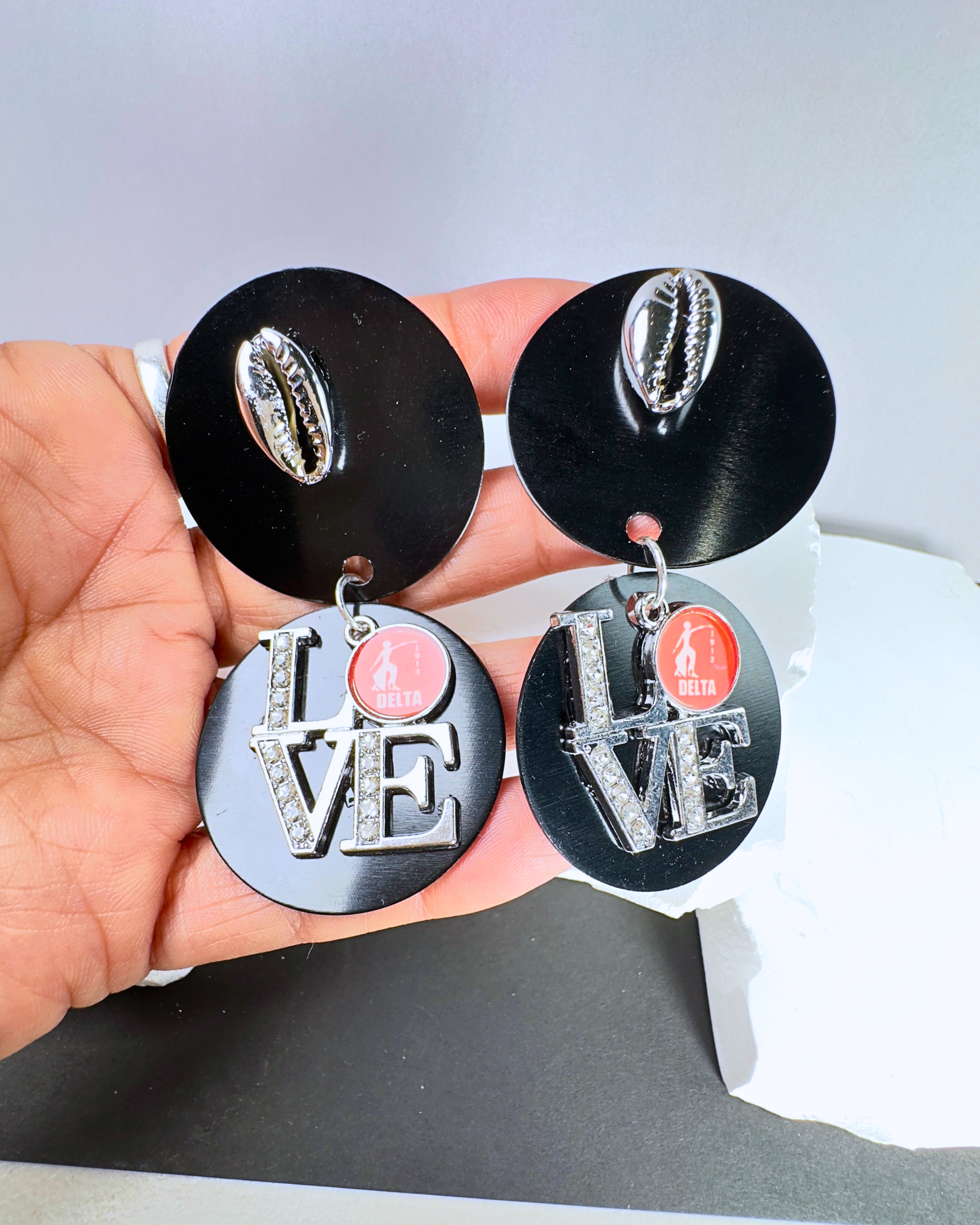 Black disc with top silver cowry shell, bottom black disc with love charm and red DELTA charm