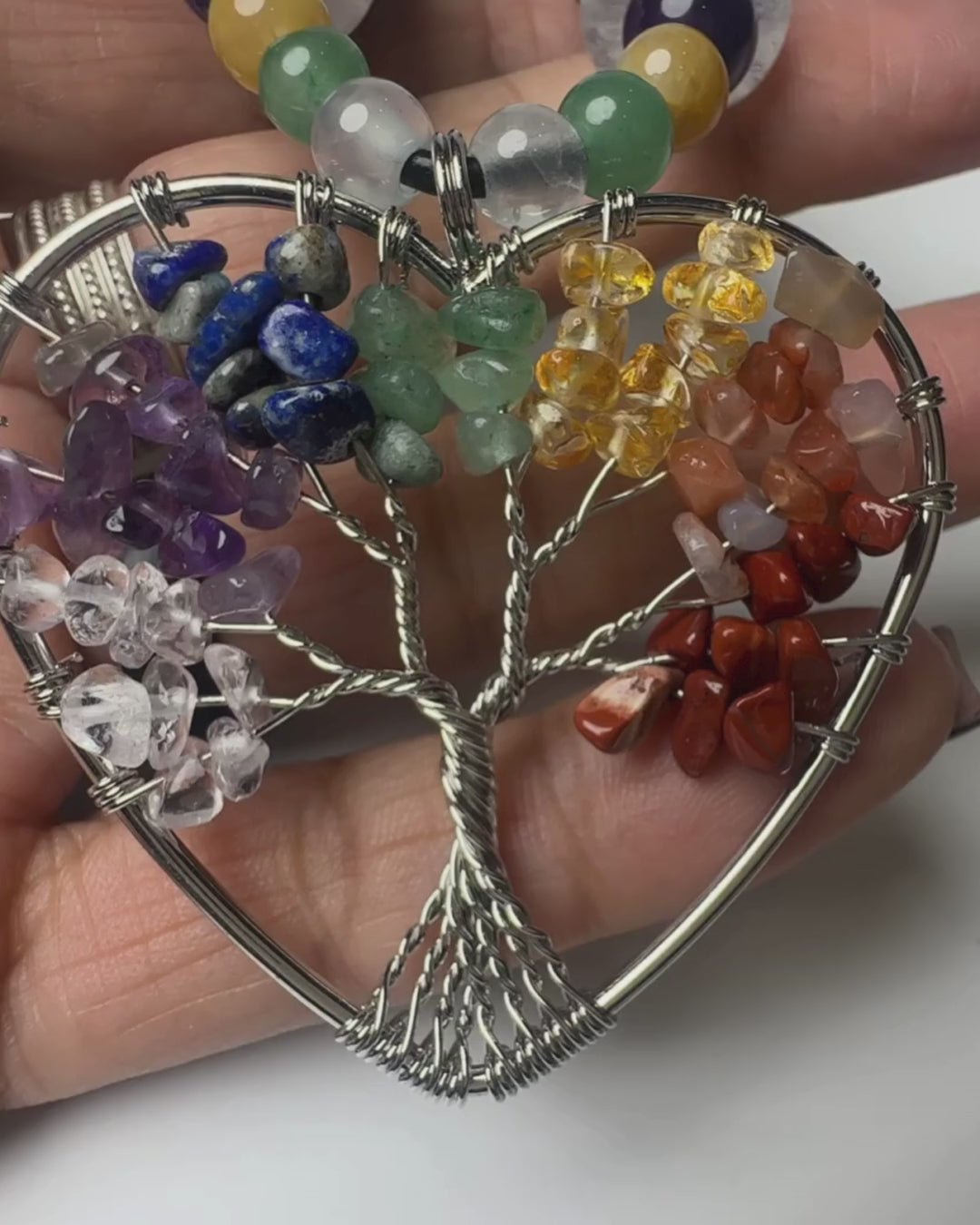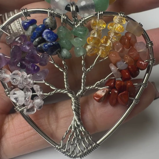 Heart silver wirewrapped silver tree of life with chakra beads on black leather cording with adjustable lobster claw clasp, with agate dangle stone detail on extension chain. Matching earrings sold separately