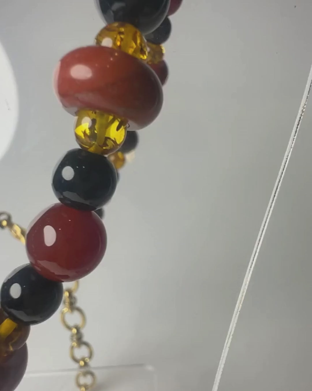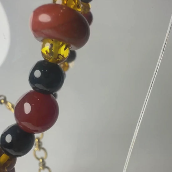 Inspiration Beaded Red Jasper "Strength" set in Black beaded in carnelian, black onyx, and amber, adjustable gold filled chain